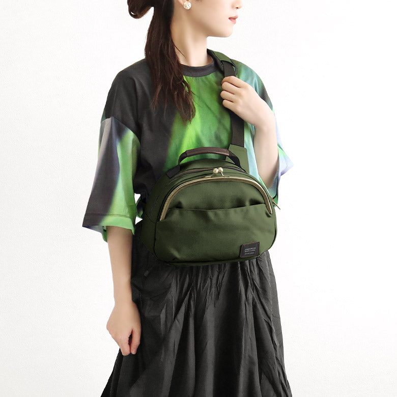 A sleek shoulder bag featuring a large clasp pouch. With a slim profile, it stays neat when worn crossbody. Made with water-repellent fabric.