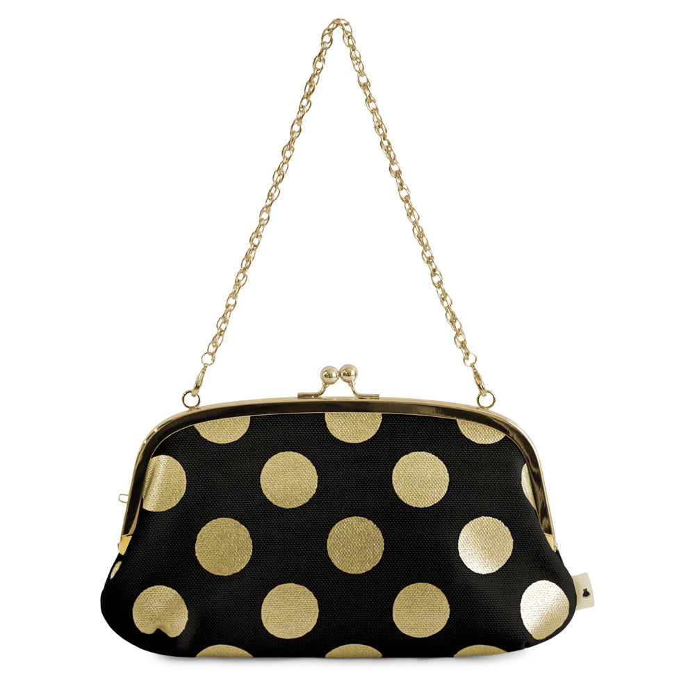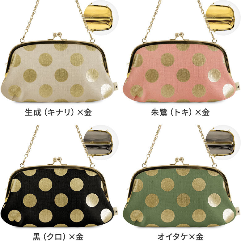 <Product Description> A large-capacity long wallet with a handle that can hold a passbook and smartphone. From the luxurious HAKU Dot series, featuring a sparkling gold finish for a unique touch, this is a horizontally long parent-child clasp wallet with ample storage capacity. One side has six card pockets, allowing you to store a total of 12 cards. In the center, there is a child clasp coin pocket that makes coins easy to see and access. The small free pockets on both sides of the child clasp are convenient for storing receipts, coupons, and more.